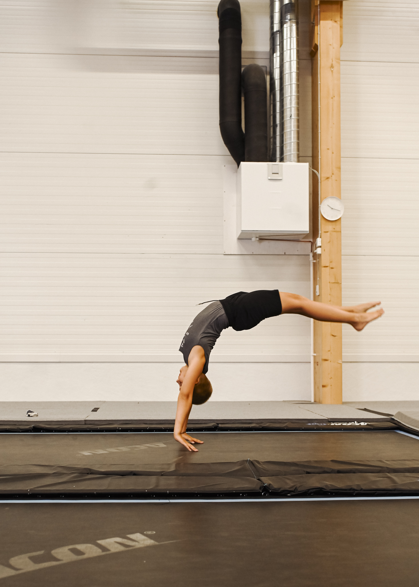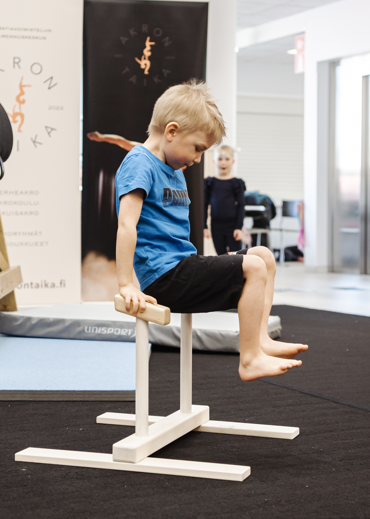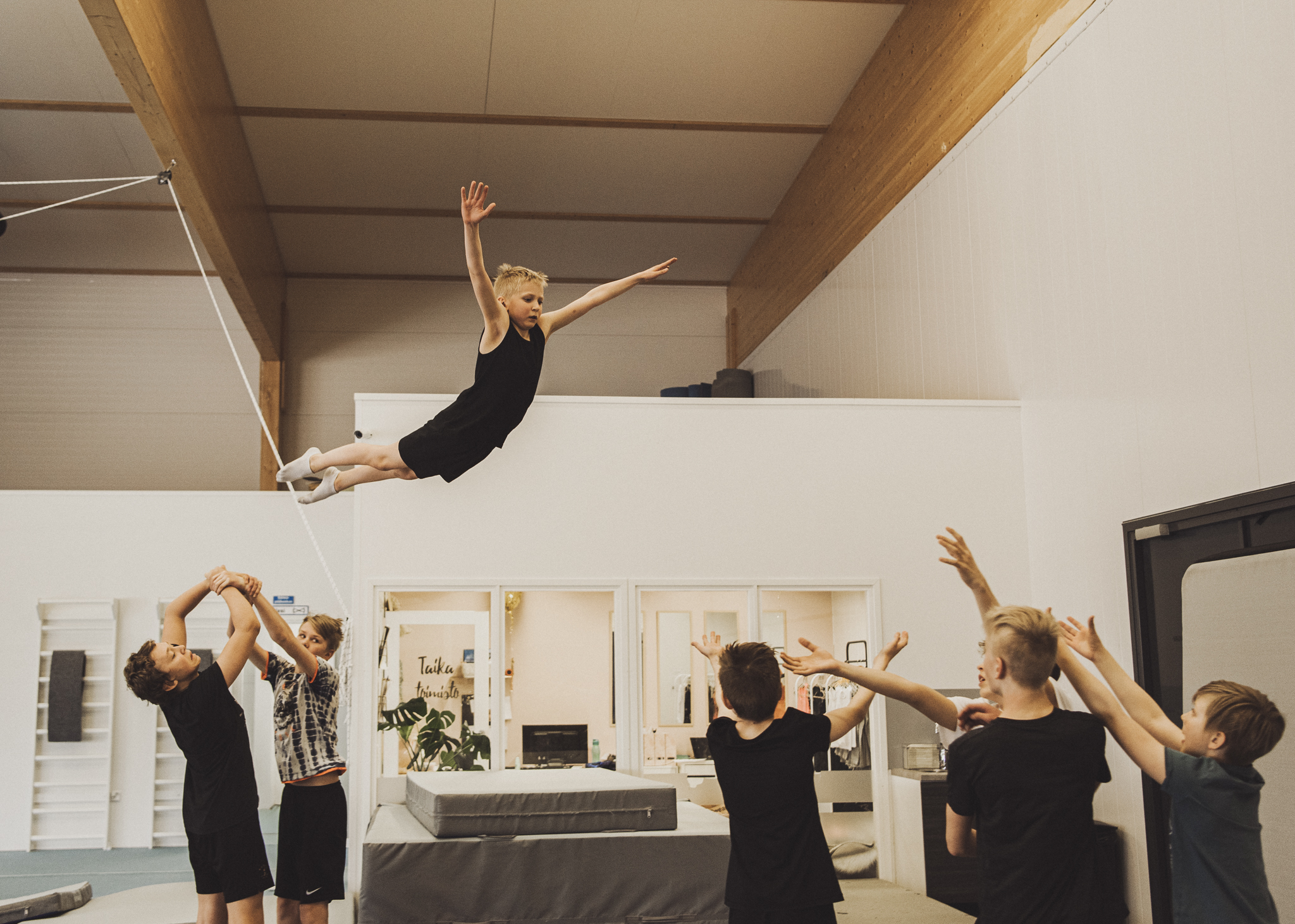 Poikien akrokouluissa tehdään temppuja, leikitään ja pelaillaan yhdessä. Pehmeät permantomatot, iso trampoliini ja volttimonttu luovat hyvät olosuhteet tempuissa etenemiseen.
